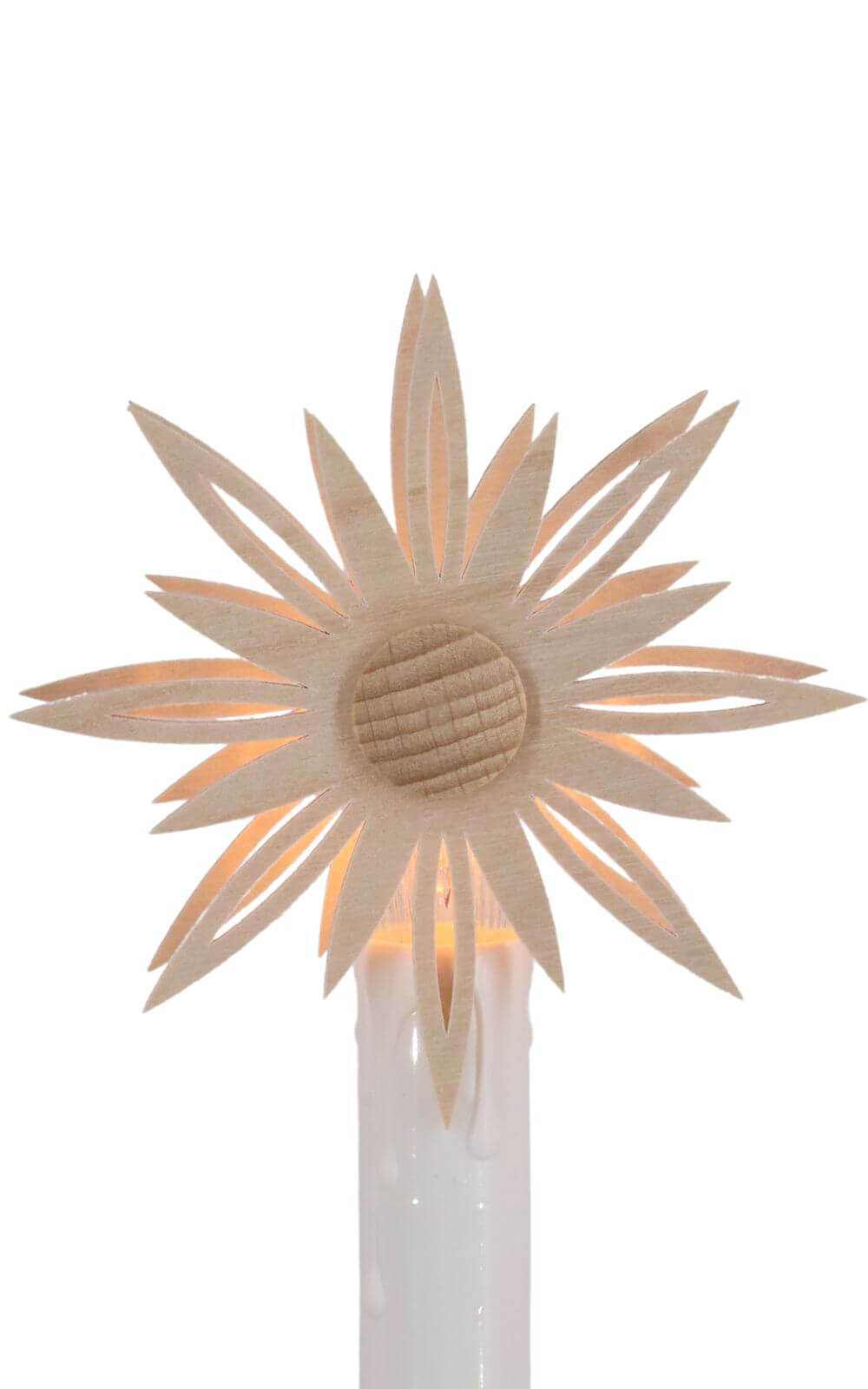 These wooden star attachments are designed for the traditional German Schwibbogen, a distinctive form of Christmas light decoration originating in Germany. The Schwibbogen is typically displayed in windows and features electric candles that glow warmly throughout the holiday season. Placed directly on top of the candle shafts, these stars add a refined decorative detail and highlight the light in a subtle, elegant way.