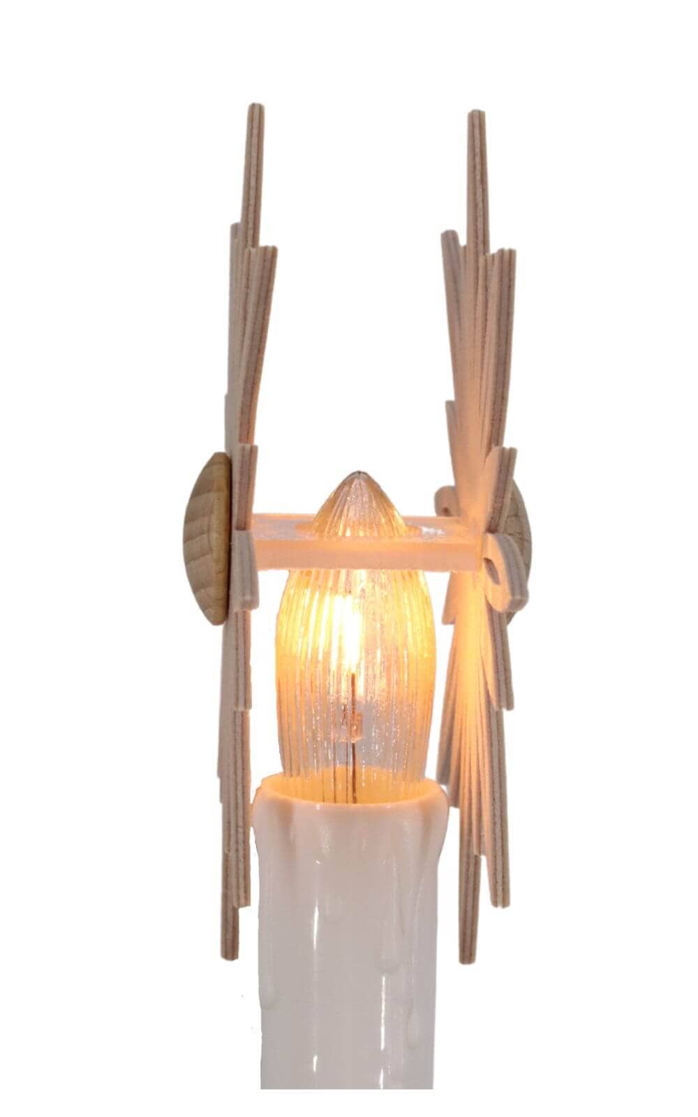 The star attachments are made to fit electric Schwibbogen with either long candle shafts or short shaft candles. They are easy to place and remain securely in position. This set includes two matching wooden stars, perfect for completing a Schwibbogen display. Intended for indoor use, they are well suited for windows, mantels or holiday displays and offer an authentic way to bring a touch of German Christmas tradition into an American home