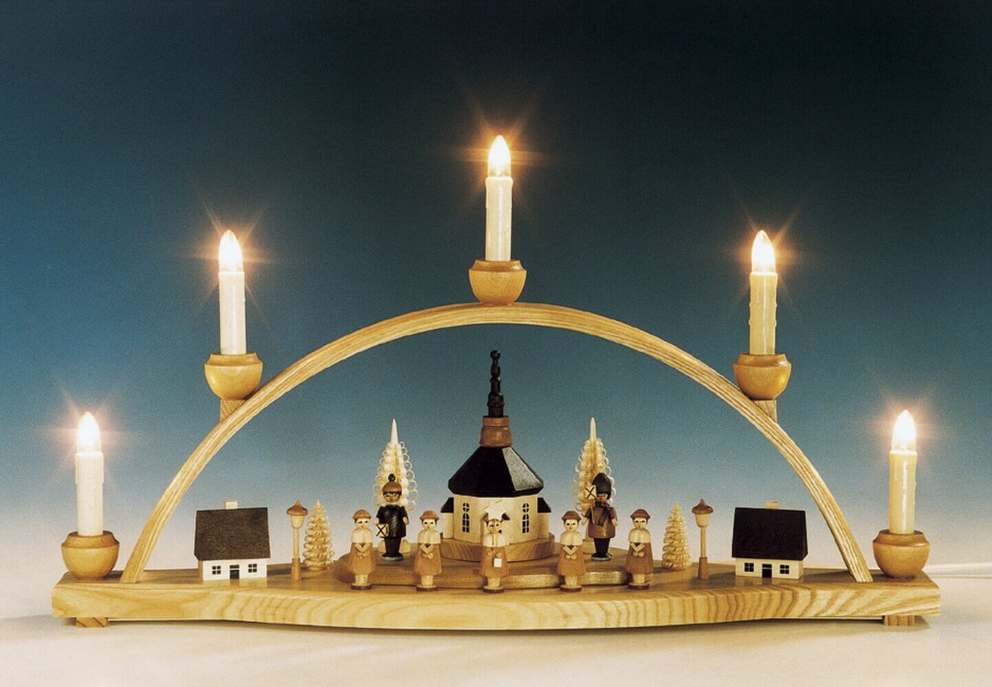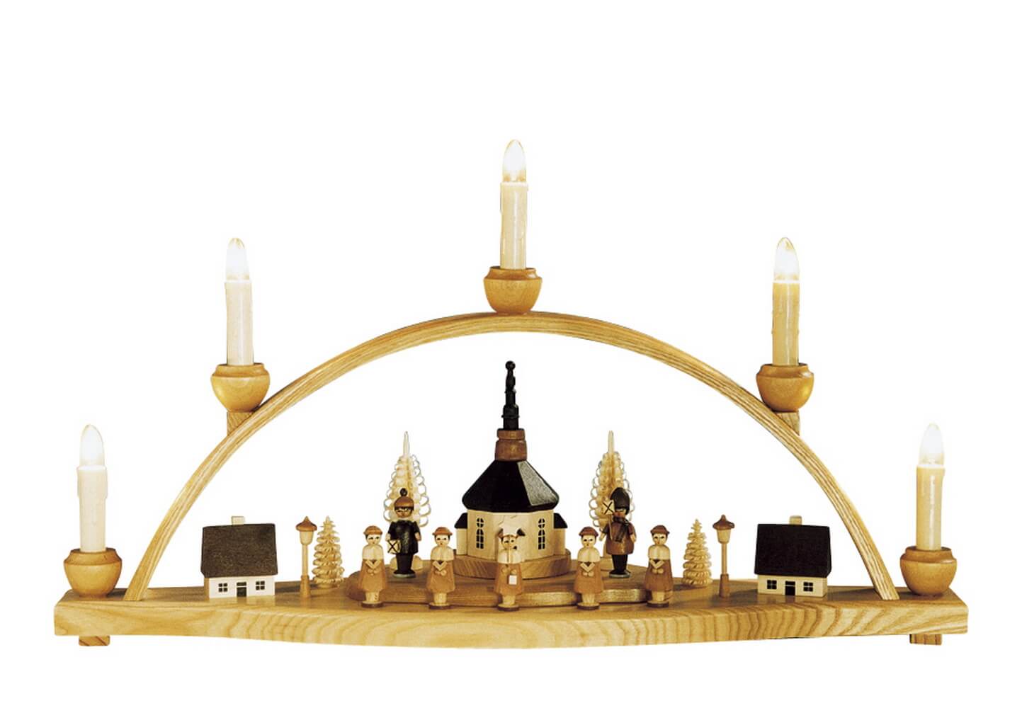 The candle arch is made entirely in Germany and is an original product by Knuth Neuber. Handcrafted in the Ore Mountains, it guarantees the highest quality and longevity. Each candle arch is carefully crafted and impresses with its detailed workmanship and the loving depiction of the Seiffen church with the lantern children.