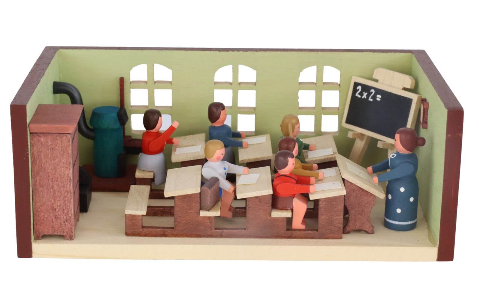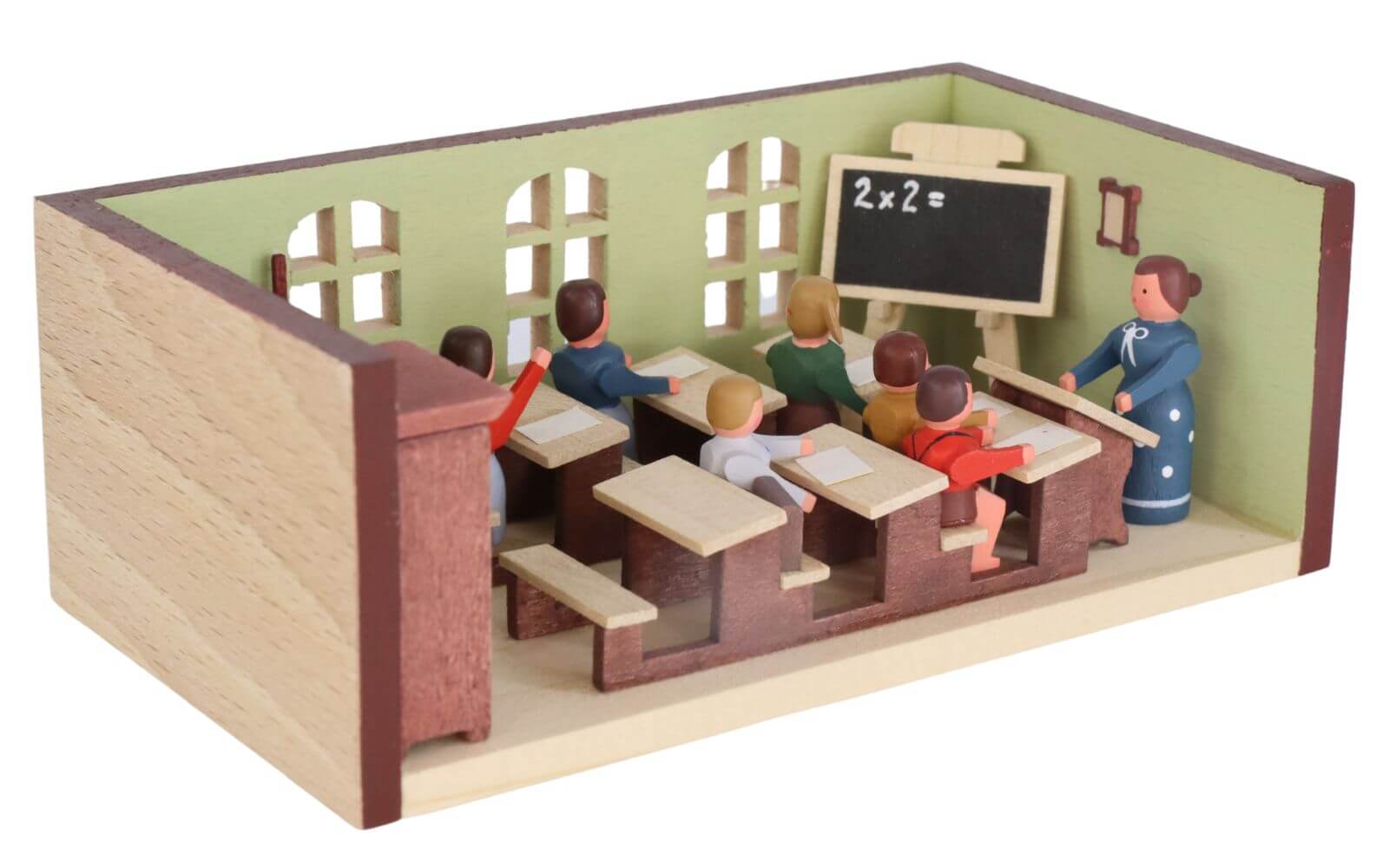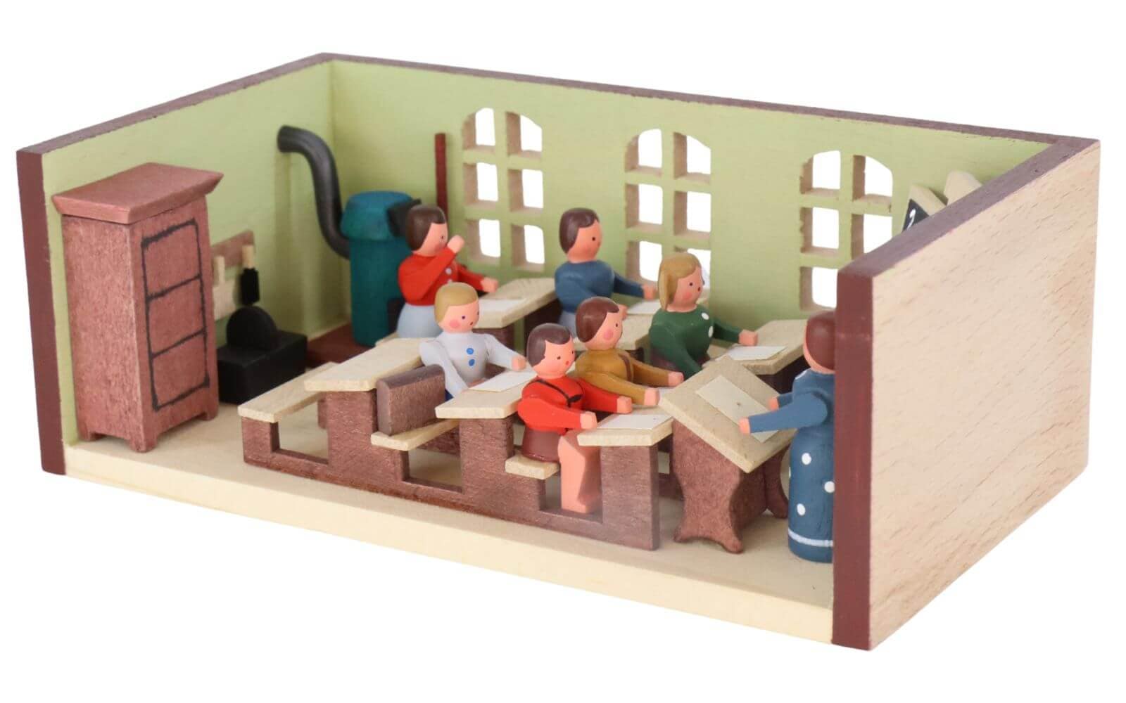 Gunter Flath and his small family business have made a name for themselves with attention to detail and passion for Erzgebirge crafts. His miniature little schoolroom with teacher is a testament to the skills and attention to detail. Each element of this miniature parlor, from the blackboard to the student desks to the teacher, is designed with the utmost care.