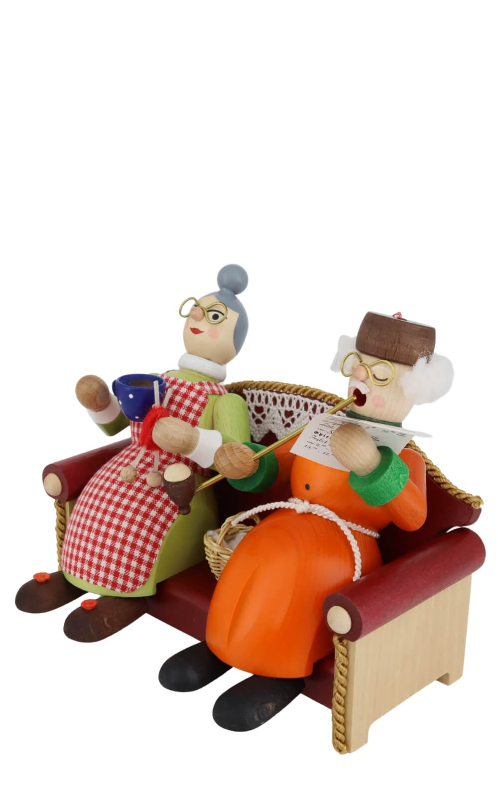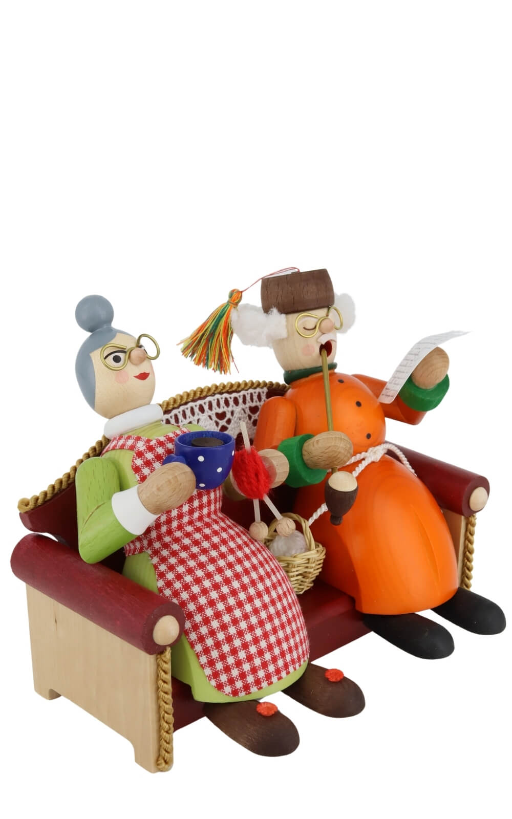 Smoking figures grandma and grandpa on the sofa by Richard Glässer from Seiffen in the Ore Mountains