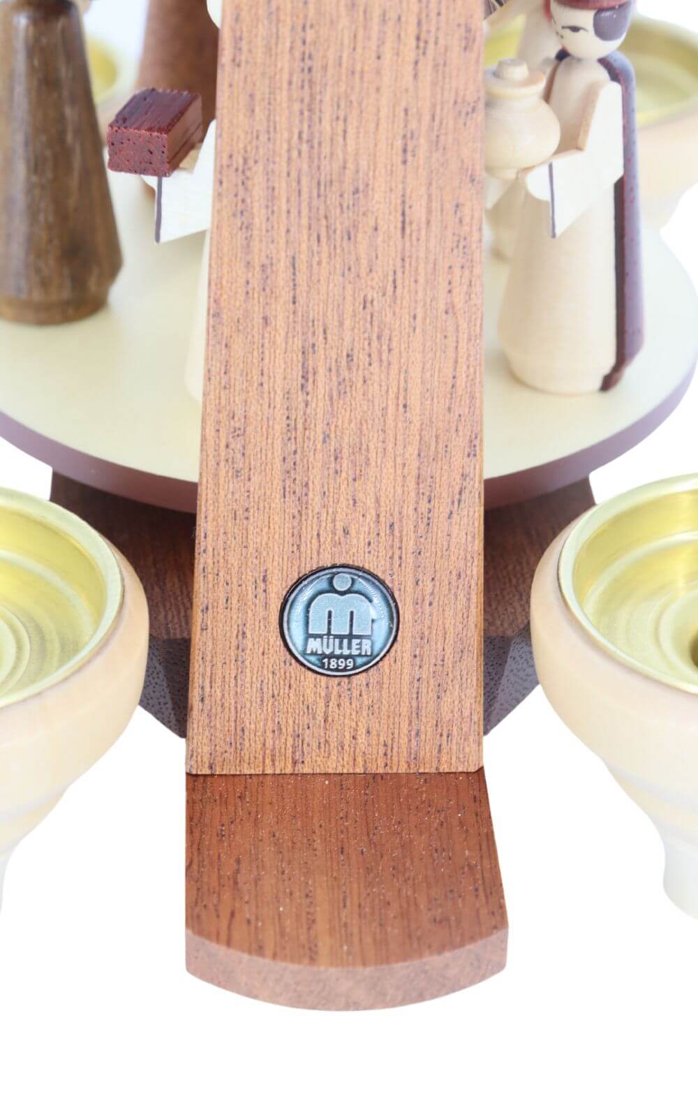 Besonders beeindruckend ist der kunstvoll gestaltete Baum in der Mitte, für dessen Herstellung eine exklusive Technik verwendet wird, die nur in den Werkstätten von Müller Kleinkunst in Seiffen angewendet wird. Dabei werden hauchdünne Blätter aus Amazakoué in die eingeritzten Ringe eines Baumstamms aus Erlenholz verleimt. Um diesen einzigartigen Baum sind die Heilige Familie und die Drei Weisen mit ihren Geschenken gruppiert, die die Szene der Geburt Christi lebendig darstellen.