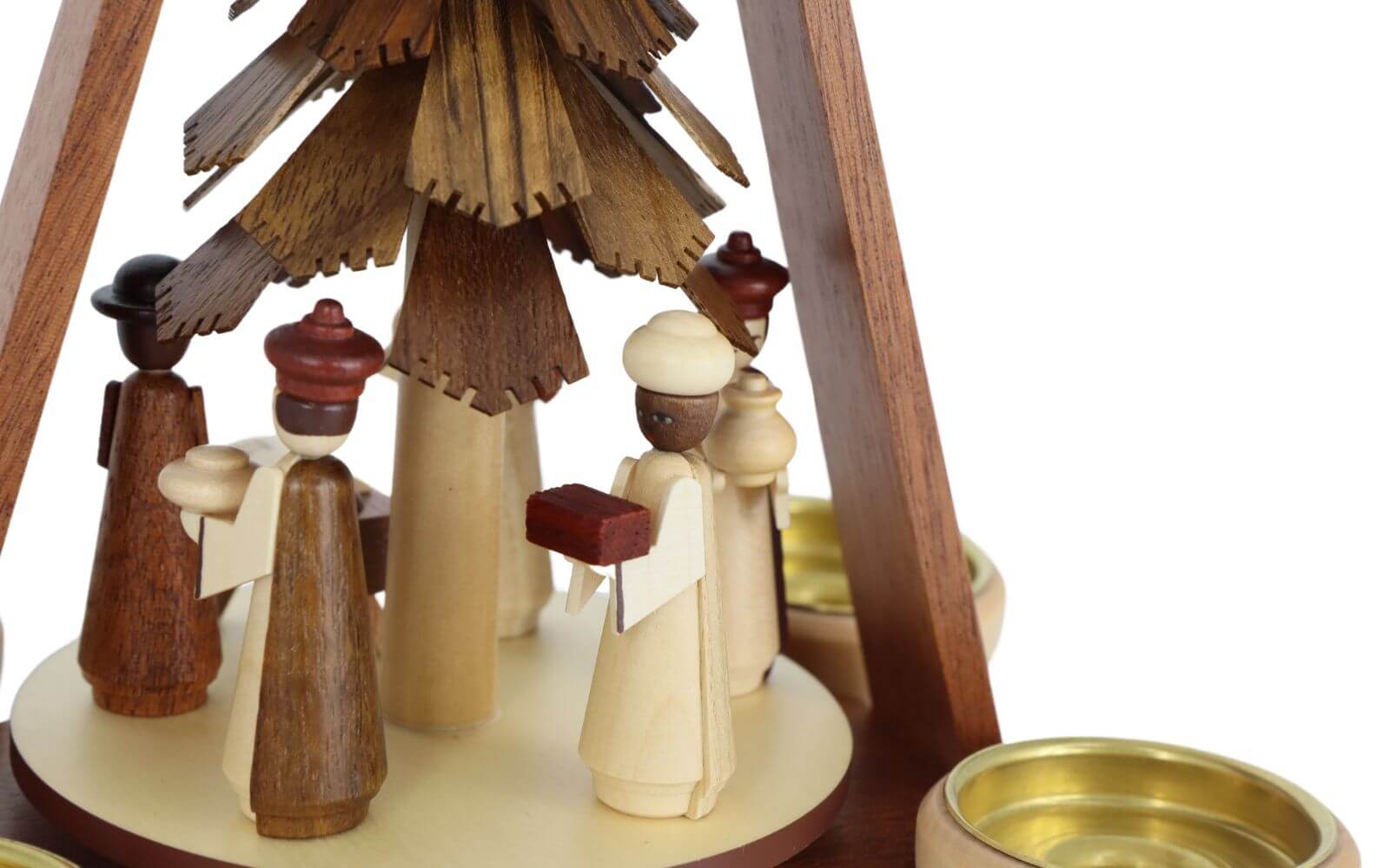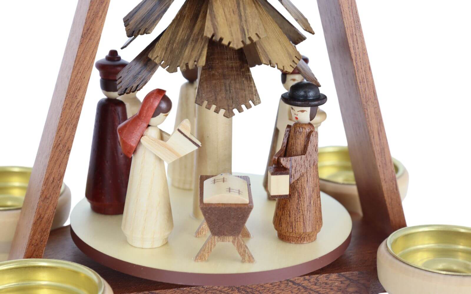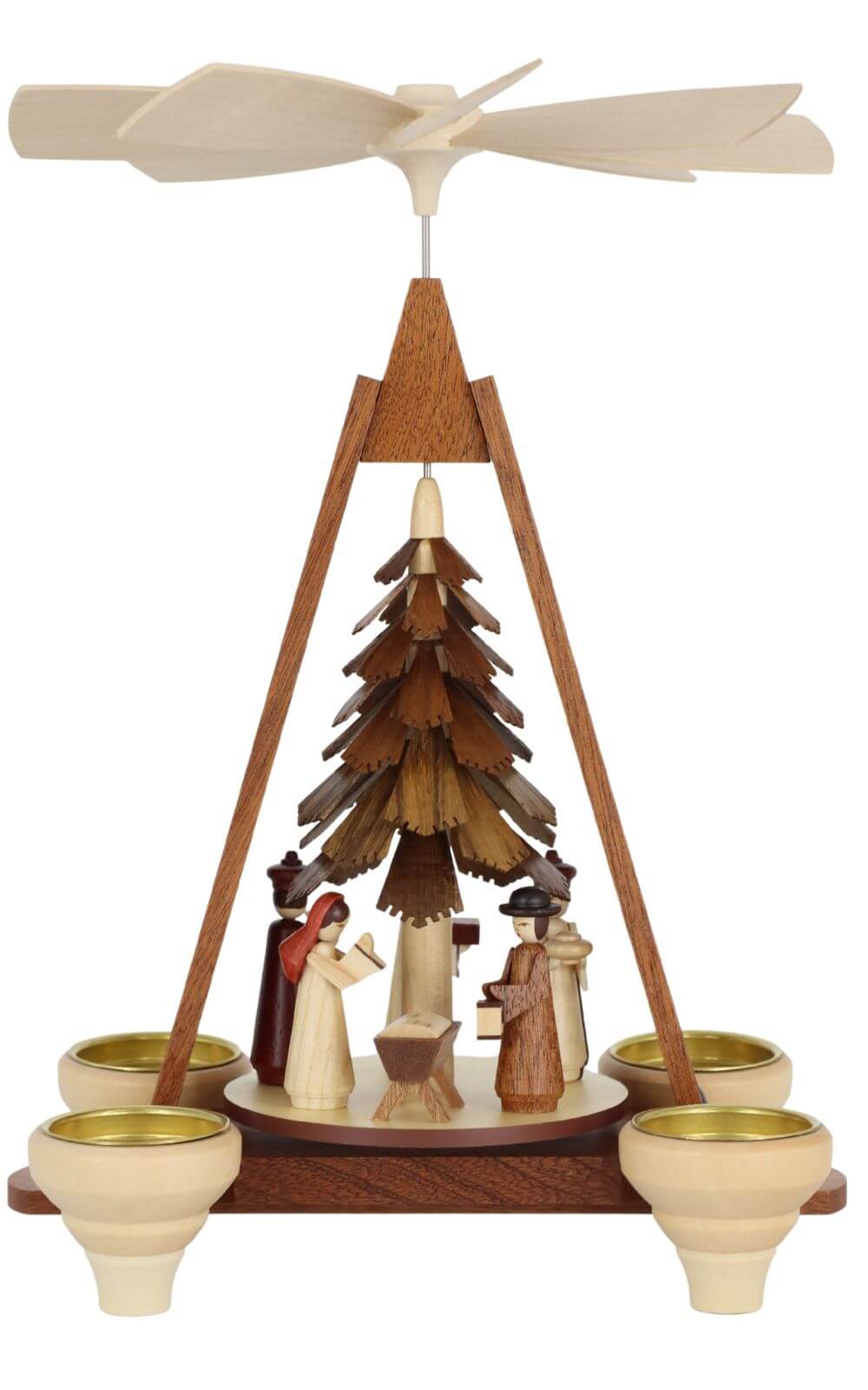 Die Pyramide wird durch die aufsteigende Wärme von vier Teelichtern oder Wachskerzen angetrieben, wodurch sich die Figuren der Heiligen Familie und der Drei Weisen sanft um den Baum in der Mitte drehen. Die natürliche Farbgebung und die hochwertigen Materialien machen diese Weihnachtspyramide zu einem echten Schmuckstück in jeder Weihnachtsdekoration und zu einem unverzichtbaren Bestandteil traditioneller Adventsbräuche.